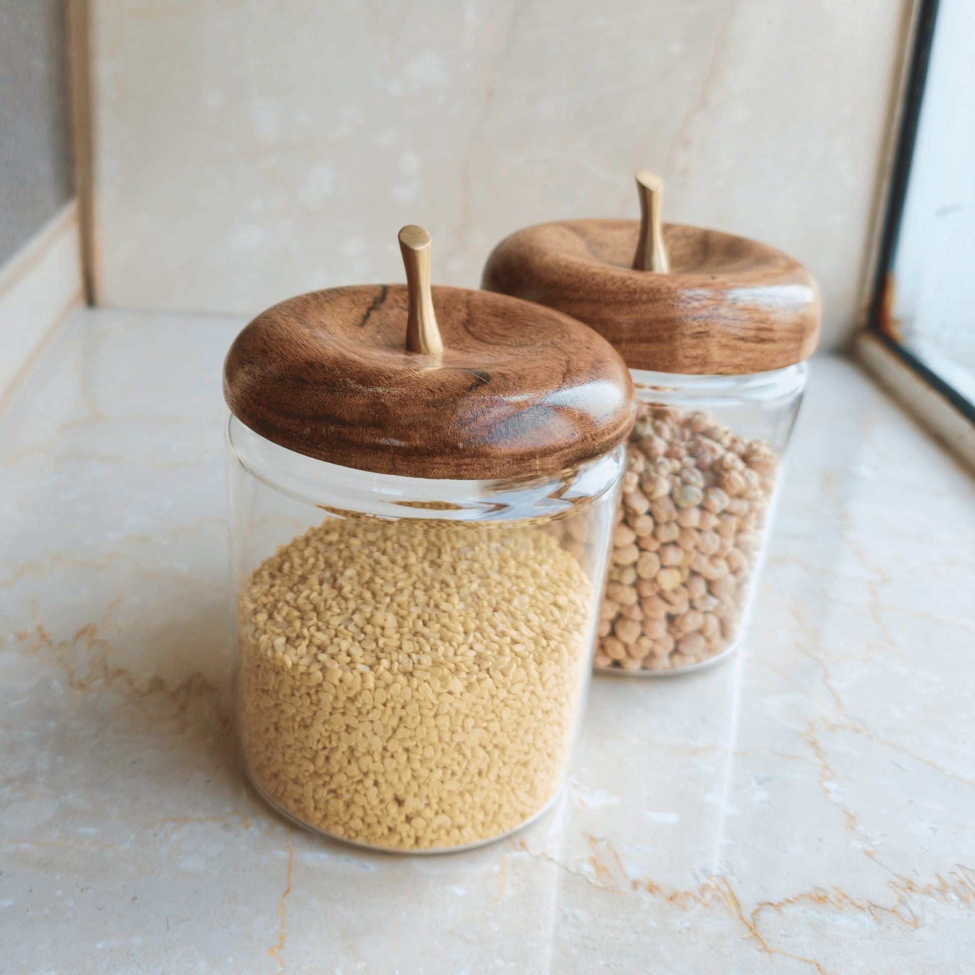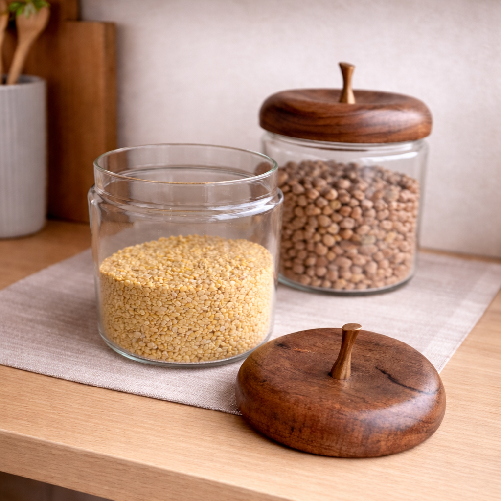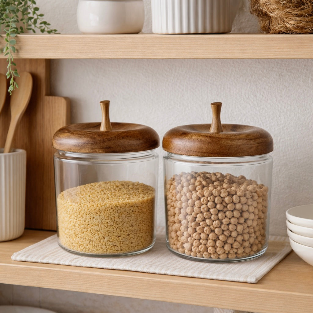 Bring charm to your kitchen with these apple shaped glass storage jars, featuring engraved wooden lids with a metallic stem for a nature-inspired touch. Ideal for storing dry fruits, snacks, or kitchen essentials, these jars combine functionality with playful elegance. A perfect blend of modern design and rustic appeal, they make a stylish addition to any countertop or dining space.
