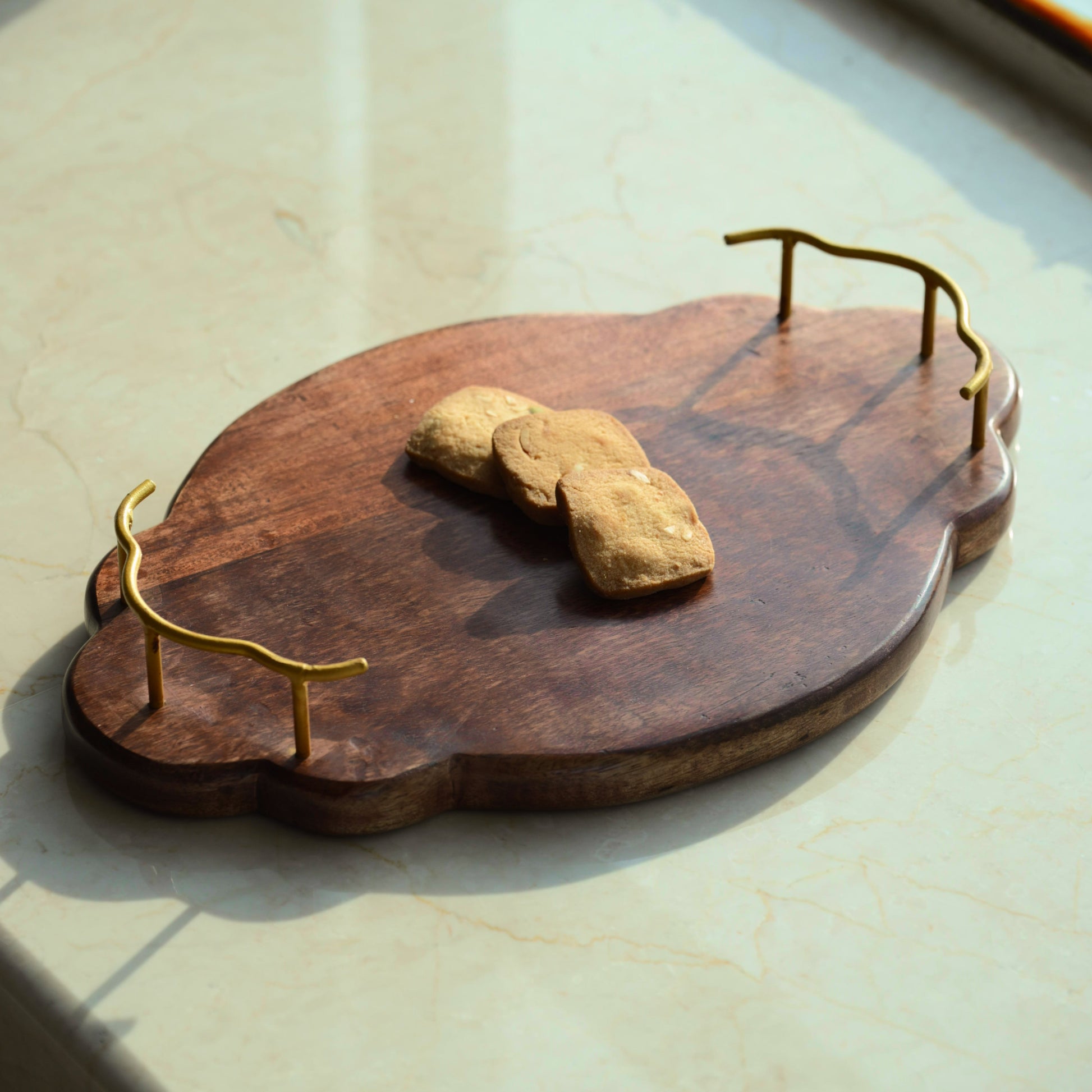 Crafted from premium wood with elegant golden handles, this multi-functional tray is perfect for serving or organizing your dining and workspace essentials. Its organic shape and sturdy design add a touch of sophistication, making it ideal for both everyday use and special occasions. A timeless blend of utility and elegance for your home.
