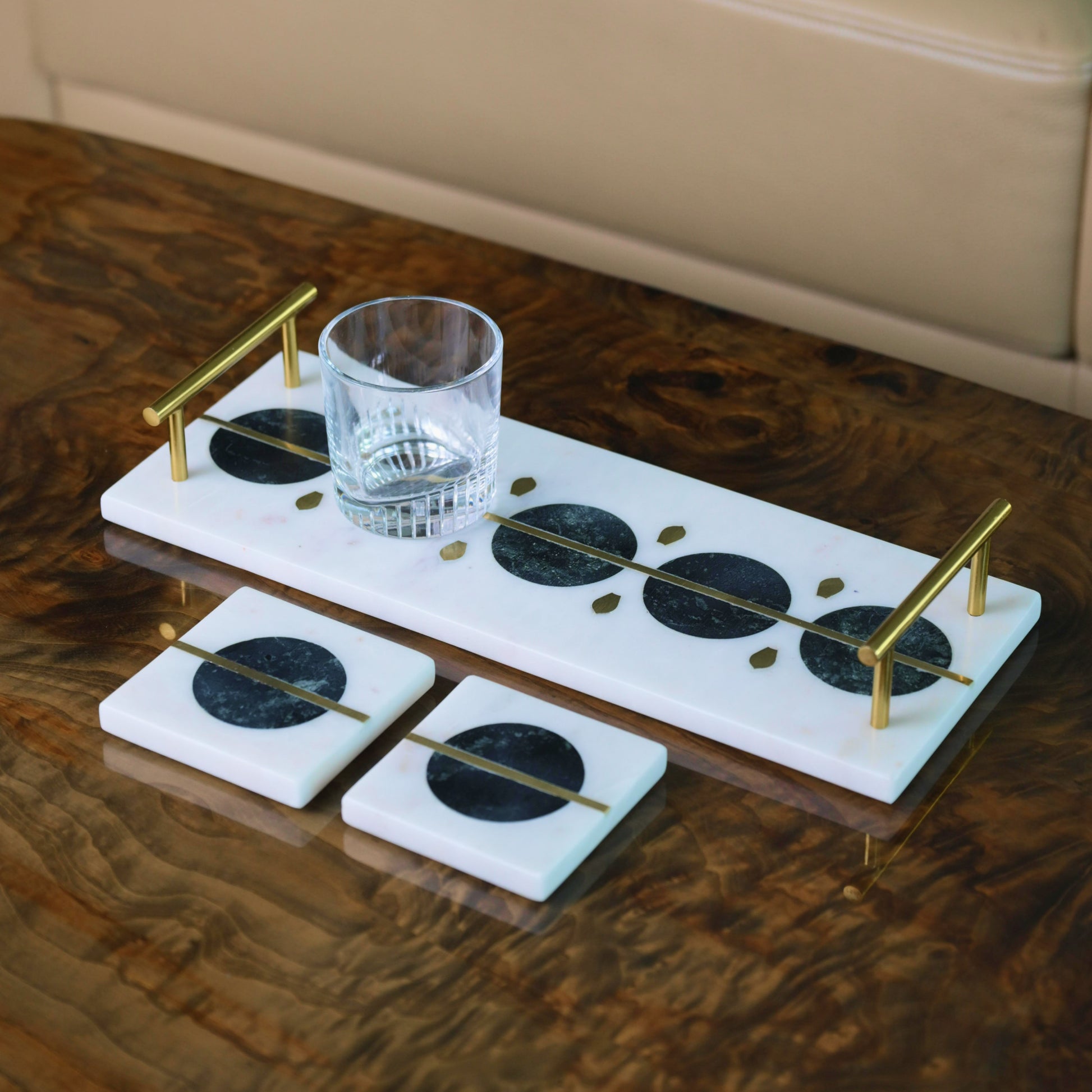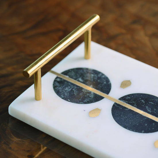Bring a touch of timeless elegance to your table with this handcrafted marble serving tray. Accented with green and gold inlay and finished with sleek brass handles, it’s perfect for serving tea, appetizers, or festive sweets in style. Beyond the dining table, it doubles beautifully as a vanity or accent tray — adding a luxurious touch to your console or dresser.
