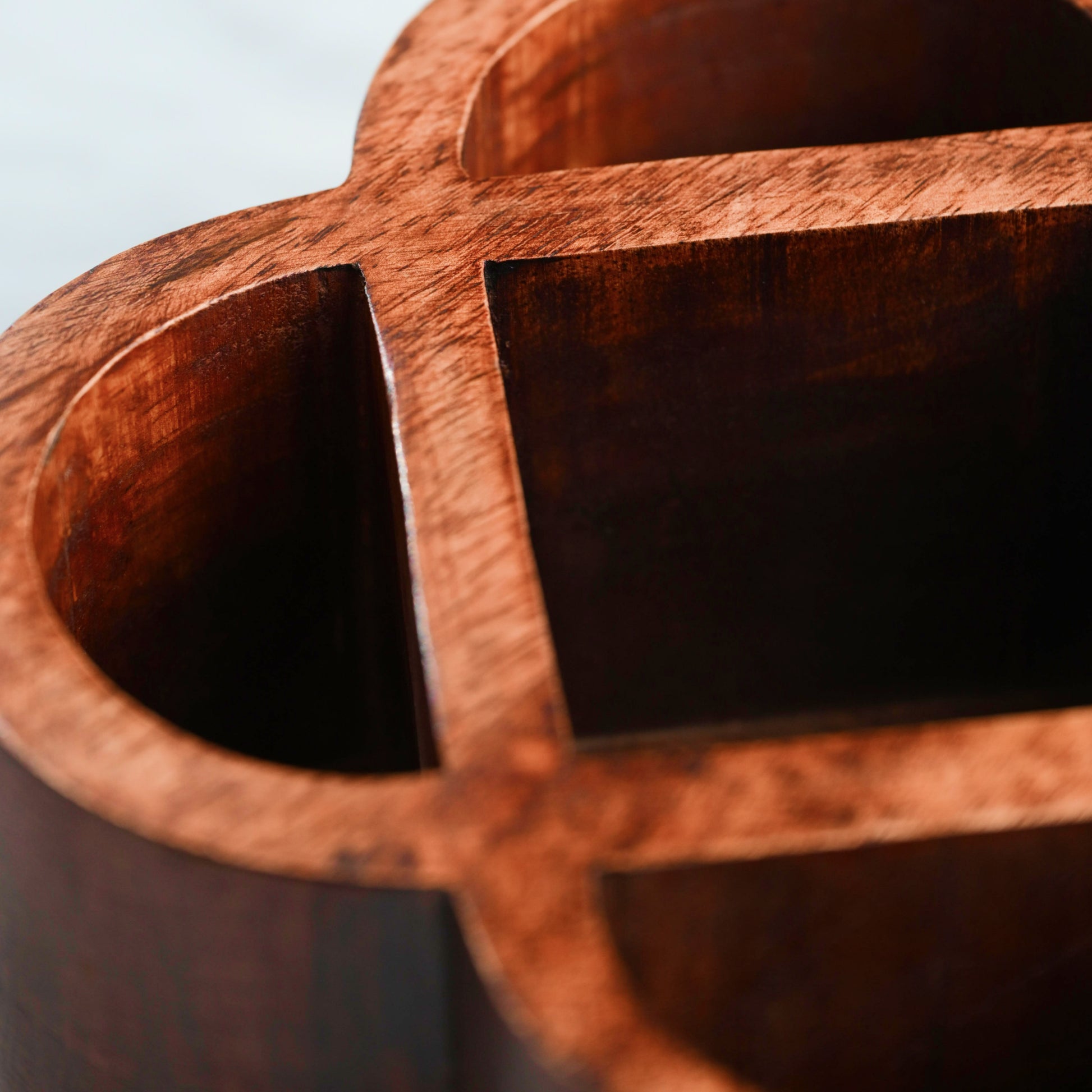 This elegant wooden cutlery holder with brass accents is a stylish and functional addition to your dining or kitchen space. Designed with multiple compartments, it keeps spoons, forks, knives, and other essentials neatly organized. Perfect for both dining tables and countertops, it seamlessly blends traditional craftsmanship with modern utility.