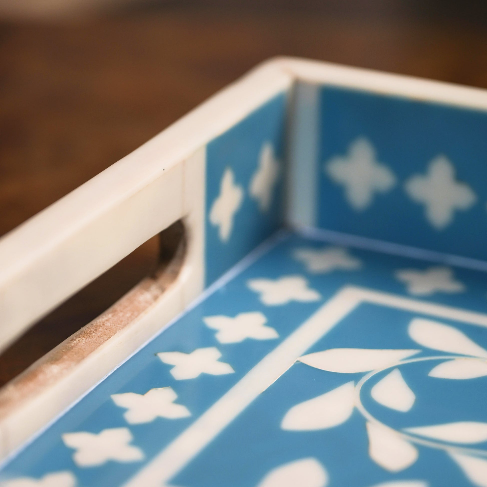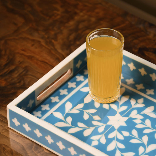 This bone inlay serving tray features a stunning blue floral mughal pattern and side handles for easy carrying. Handcrafted with precision, it's perfect for serving tea, coffee, or snacks, and doubles up as a beautiful tabletop accent. Ideal for modern homes, hosting, or gifting with style